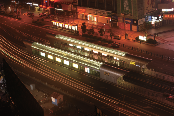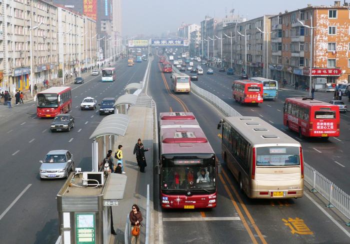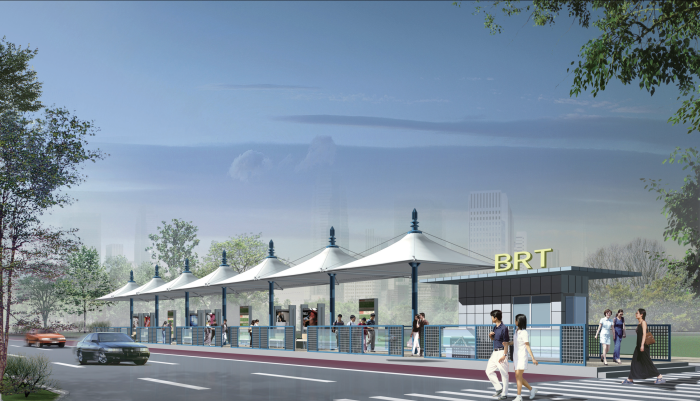 大連市快速公交(BRT) 1號線在興工街站與具有快速公交基本特徵的有軌電車202路、201路和203路貫通線銜接,構(gòu)成近期大連市快速公交“T”字形主框架。在設(shè)計(jì)中根據(jù)沿線建設(shè)環(huán)境,因地制宜、靈活選擇BRT專用車道在道路斷面中的位置,以路中佈置為主,依次採用了混行、路中式、雙向同側(cè)式等專用道佈置方式,是國內(nèi)首次在一條線路中採用多種專用道佈置方式。這一設(shè)計(jì),大大地減小了道路改造工程量,提高了運(yùn)營速度。項(xiàng)目注重結(jié)合BRT進(jìn)行交通組織優(yōu)化設(shè)計(jì),大膽地對BRT線路沿線的交通癥結(jié)進(jìn)行合理改造,使困擾多年的大連BRT友誼立交橋交通堵點(diǎn)得以剷除,並實(shí)現(xiàn)了立體交叉口BRT優(yōu)先。車站與人行過街設(shè)施有機(jī)結(jié)合,最大程度地保證了行人的過街安全,保證了車輛行駛的暢通。簡潔型站臺,在滿足基本功能的同時(shí)大大節(jié)省造價(jià)。