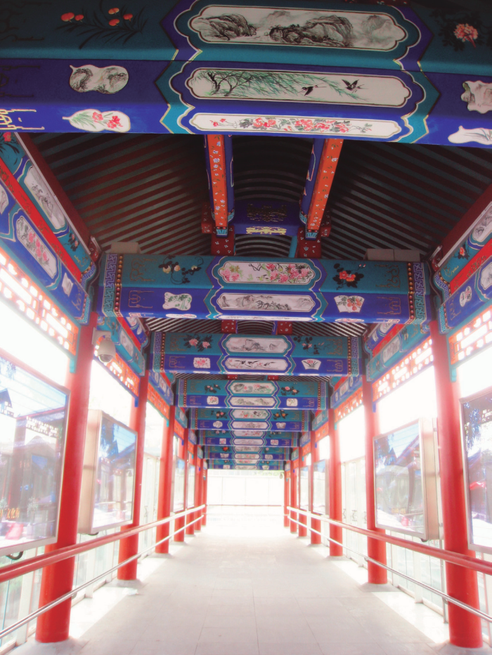 The Art Gallery Bridge of Beijing Liulichang is located on the south side of the crossing between South Xinhua Street and East and West Liulichang Street. It mainly functions as a bridge connecting the east and west sections of Liulichang, an overpass for passengers and a corridor for cultural exhibition. The project covers an area of 738.62m2, with a construction area of 365.87m2. The main bridge is 33m long and 4m wide. The upper part takes the design of ancient corridor with a round ridge roof...