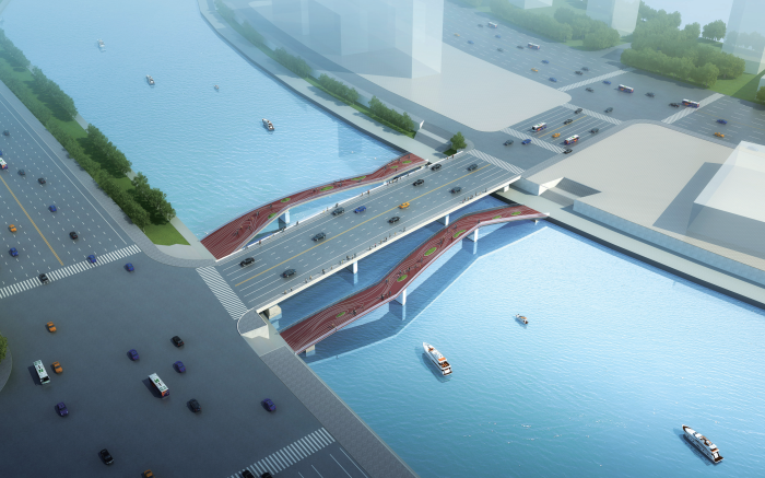 Longxing Bridge (the bridge of Ruyi East Road crossing Longhu Lake) Project includes the bridge engineering, road engineering, lighting engineering, deck drainage engineering and cross-river pipe rack. The right road way (directed to the island) measures 205.373m long and the bridge section 158m and road section 47.374m; the left road way (direction of leaving the island) is 218.507m long, with the bridge section 159.2m long and road section 59.307m. The bridge span layout is 31+50+40+30 (m); the...