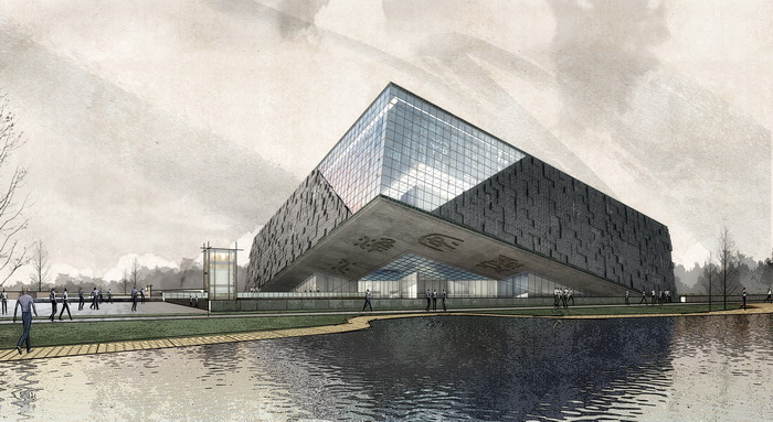專案用地面積約125000 平方米, 總建築面積約54000 平方米, 其中一期主館約29000 平方米, 二期附屬建築約25000 平方米。主館地上部分採(cǎi)用純鋼結(jié)構(gòu), 最長(zhǎng)懸挑約30 米, 外立面由玻璃和石材構(gòu)成,建築形式採(cǎi)用中國(guó)傳統(tǒng)建築形式——“璽”的造型。