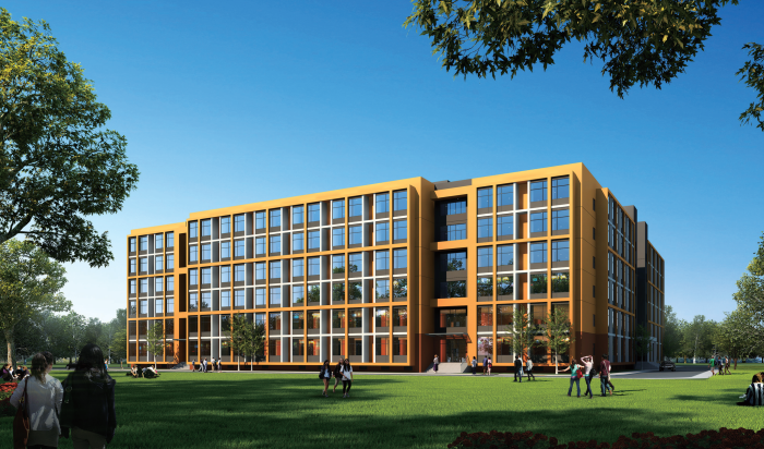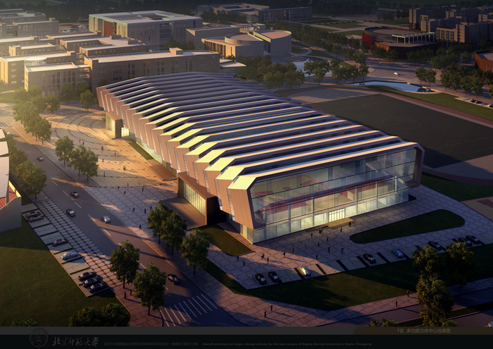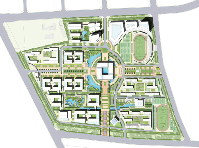 Guided by the design concept of “merged green campus”, it is divided into three parts: central teaching zone, living and service zone and sports zone.