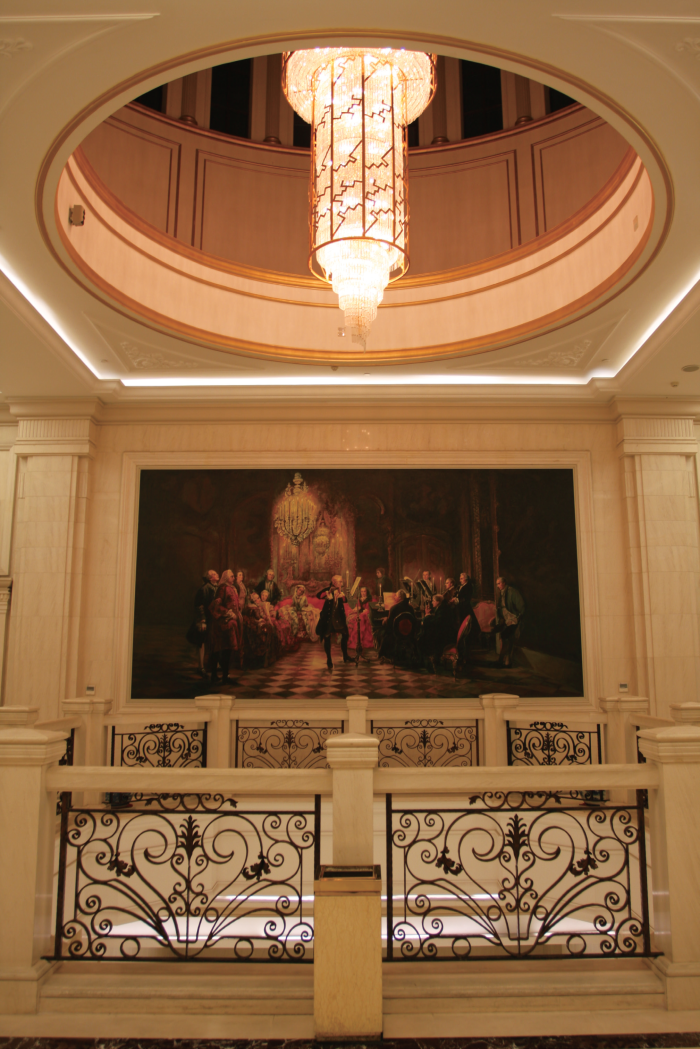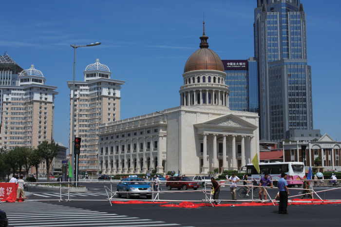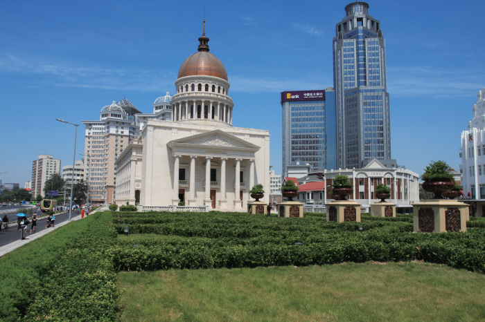 This music hall is in a classical European style, with milk white appearance, and a golden yellow dome on the tower, known as the“Golden Hall”in Tianjin. The music hall has four storeys above the ground, with a total height of 16.35m, and local dome above the roof for 21.9m, the total area of the hall is 4,860 square meters, and it consists of the front and main halls (with 700 audience seats), stage (performance hall), rear stage (dressing room), rehearsal hall and VIP reception hall. The ha...