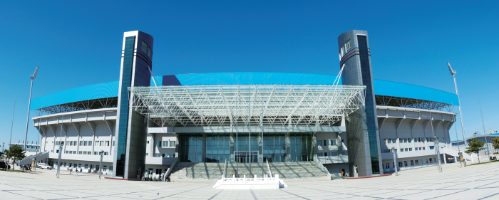 The main body structure of the indoor stadium consists of two staggered semi-circles of different diameters, with 22 round columns each with a diameter of 1m and two big box columns, connected horizontally by three ring beams.