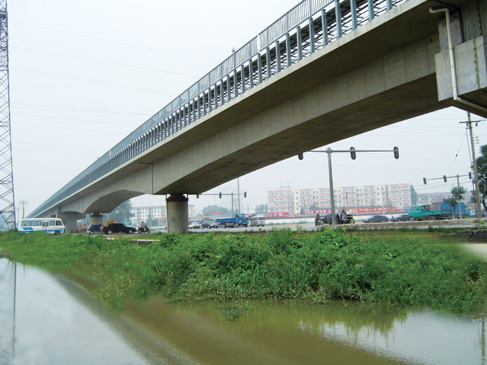 北京地鐵八通線是北京地鐵一號(hào)線的東延線,線路全長(zhǎng)18.964km,其中地面線長(zhǎng)7.911km,高架橋梁長(zhǎng)11.053km,橋梁面積97266m2。該工程為國(guó)內(nèi)第一條以預(yù)制工法為主的高架城市軌道交通工程,設(shè)計(jì)中充分考慮了軌道交通橋梁施工協(xié)作的優(yōu)勢(shì),全線設(shè)置三個(gè)預(yù)制梁廠,上下部結(jié)構(gòu)同時(shí)施工,土建工期僅用一年的時(shí)間即全部完成。全線標(biāo)準(zhǔn)梁采用的工型組合梁結(jié)構(gòu),與箱梁結(jié)構(gòu)相比,運(yùn)營(yíng)結(jié)構(gòu)噪聲小。斜跨京通快速路采用的鋼蓋梁-混凝土門墩組合梁結(jié)構(gòu),大大降低了結(jié)構(gòu)高度,對(duì)類似上跨道路的工程有很強(qiáng)的借鑒意義。