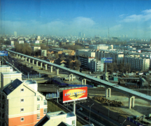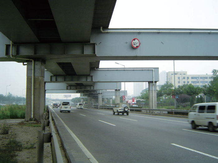 北京地鐵13號(hào)線西起西直門,沿京包鐵路線西側(cè)北上,再沿東北內(nèi)環(huán)的北側(cè)向東,至劉各莊道口前轉(zhuǎn)向南,接望和支線,終點(diǎn)東直門,線路全長(zhǎng)為40.8km。全線橋梁總長(zhǎng)約12944m,橋梁面積114238m2。該工程為北京第一條有高架線的地鐵工程,設(shè)計(jì)充分考慮了軌道交通橋梁作為城市橋梁的特點(diǎn),采用現(xiàn)澆預(yù)應(yīng)力混凝土連續(xù)箱梁,是國(guó)內(nèi)軌道交通首次采用。指揮中心處橋梁支座采用國(guó)際先進(jìn)的隔振彈簧支座,在國(guó)內(nèi)橋梁上首次采用,該支座大大減小了列車沖擊荷載對(duì)指揮中心的振動(dòng),效果良好。