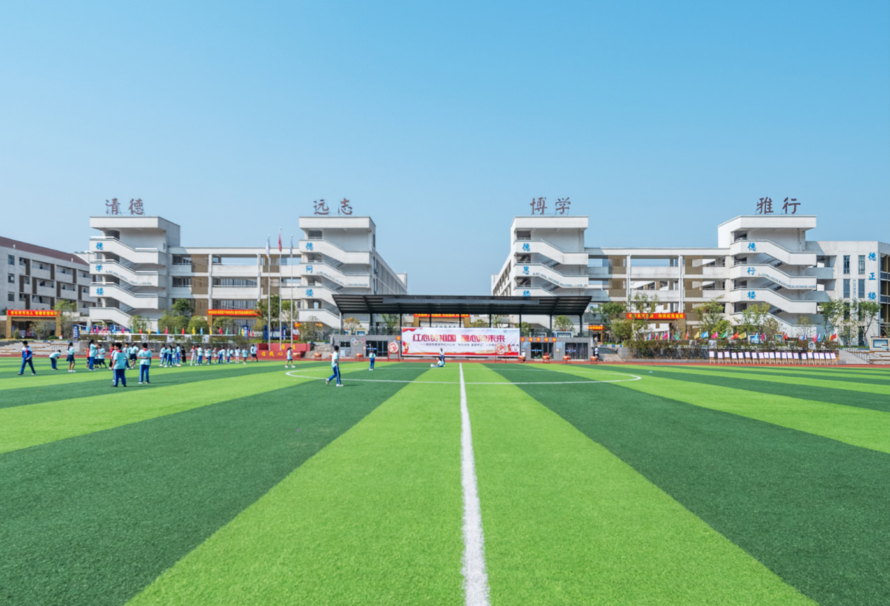The campus consists of teaching buildings, a library, an art building, an office building, a stadium, dormitories, canteens and a track field. The entrance lies on the north, facing Deqing Road. The west of the entrance is the office building while on the east is the stadium bordering on a track field on the south. Four teaching buildings sit on the south of the office building, two of which are designed for secondary school students, the other two for pupils. The campus has another entrance on t...