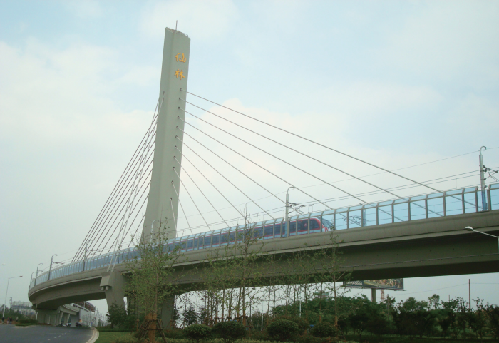 This is the first single-tower single cable plane curve cable-stayed metro bridge. The main tower is equipped with dorsalfunicular horizontally (anchor cable) and this is the first one used in the metro bridge of China. The cable-stayed bridgeadopts the asymmetric tension technique. This design is the first application in China. The red-crowned crane shapedmain tower looks beautiful with a unique and novel structure. This bridge is a curve structure with a single cable plane. Under the effect of...