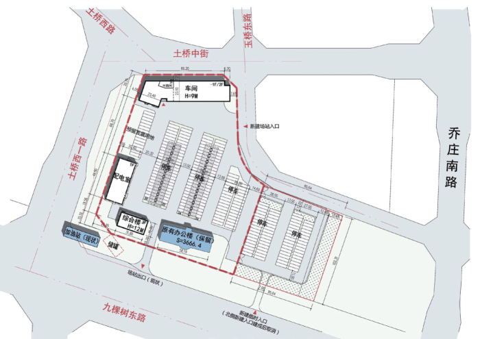 The total planned land area is 29425.934 square meters. And the total construction area is 9564 square meters, among which the floor area of 8658 square meters and underground area of 906 square meters. The newly-built buildings are respectively new maintenance workshop and comprehensive building. In addition, the power charging and support area is used for power distribution room of charging piles, which is built separately by power sector.This works is a reconstruction and extension project of ...