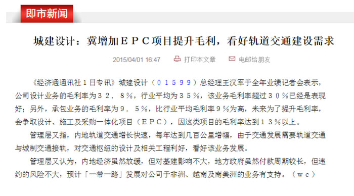 2014年公司業(yè)績(jī)表現(xiàn)優(yōu)秀,截至二零一四年十二月三十一日止年度,公司實(shí)現(xiàn)收入為人民幣33.46億元,較上年同期收入人民幣29.23億元增長(zhǎng)4.23億元,增幅14.5%。實(shí)現(xiàn)凈利潤(rùn)為人民幣3.51億元,較上年同期凈利潤(rùn)人民幣2.36億元,增長(zhǎng)1.15億元,增幅48.7%。實(shí)現(xiàn)毛利人民幣7.54億元,較上年同期人民幣5.86億元增加人民幣1.68億元,增幅28.7%,綜合毛利率由20.0%增加到22.5%。EPC項(xiàng)目也取得重要發(fā)展。