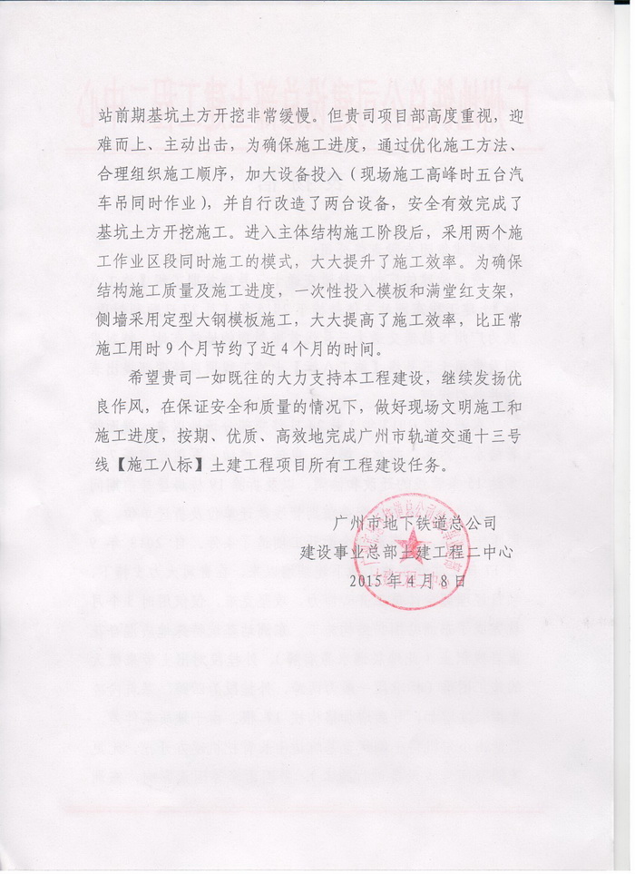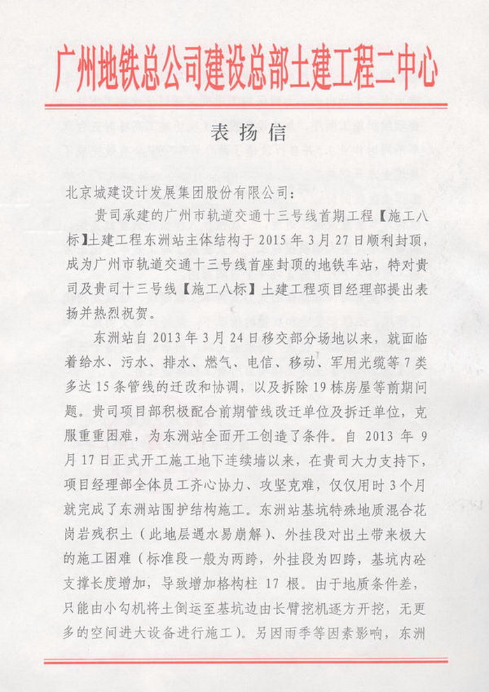 The main structure of Dongzhou Station of Guangzhou Metro, contracted by the General Contract Department of UCD, was completed recently, becoming the first metro station of Guangzhou Metro Line 13 with main structure completed. The Construction Headquarters of Guangzhou Metro sent a letter of recommendation to praise all members of the Project Department of the 8th Tendering Section of Guangzhou Metro Line 13 for their concerted efforts and hard work.