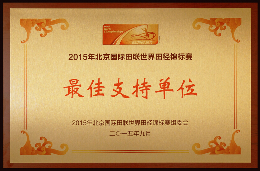 由于公司對2015年北京國際田聯(lián)世界田徑錦標(biāo)賽工作的積極支持,近日,公司被2015年北京國際田聯(lián)世界田徑錦標(biāo)賽組委會授予“最佳支持單位”,公司傅依萱同志也獲得個人榮譽(yù)證書。