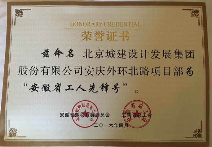 At the Conference on Celebration of the May Day, Devotion to “Adjustment, Transfer and Promotion and Contribution to 13th Five-Year Plan” of Anhui Province held on April 29, the Department of WaihuanBeilu (North Road of Outer Ring) Project in Anqing was conferred the honorary title of “Worker Pioneer in Anhui Province” by the Anhui Province Labor Competition Committee and Anhui Provincial Trade Union.