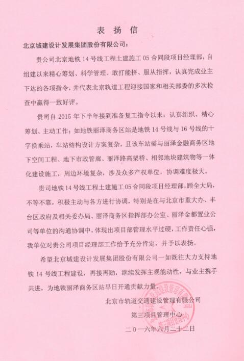 6月22日,北京市軌道交通建設(shè)管理有限公司發(fā)來表揚(yáng)信,對(duì)公司北京地鐵14號(hào)線05標(biāo)在復(fù)工準(zhǔn)備工作中的突出表現(xiàn)給予肯定,并予以表揚(yáng)。