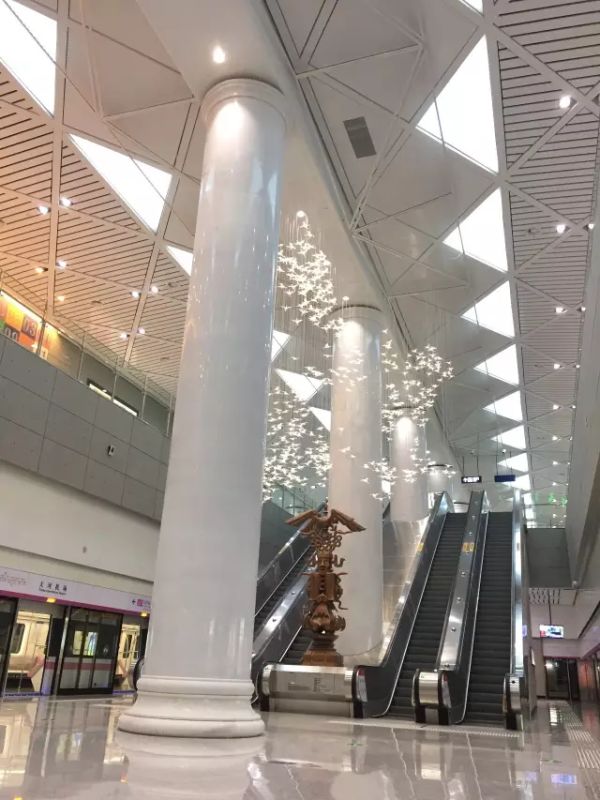 天河機場站的建筑空間打破了以往的地鐵站形式,站臺與站廳中間樓板采用了鏤空的設計,結合高大的結構柱特征我們采用水晶白石材,形體上以歐式羅馬柱造型進行塑造。墻面也首次選用淺灰色高強水泥纖維掛板,與車站空間氣質和諧契合,同時因其質感柔和帶給人溫馨舒適的感受。在頂面的造型設計上,以柔和的頂面弧形,營造一種視覺層次的變化。頂面中間部分通過三角形拉絲鋼板網(wǎng)有序拼接成機翼形狀,與機場站建筑主體“鳳舞九天”相呼應。