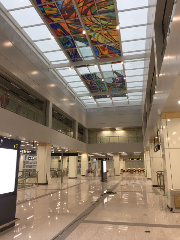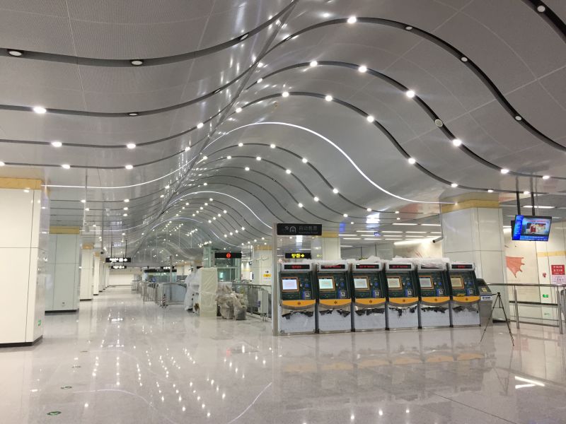 該項目是鄭州首次采用高架敷設(shè)的城市軌道交通線路,高架段全線采用了在橋梁中間設(shè)置疏散平臺和接觸網(wǎng)的方案;首次成功在預(yù)制U梁上采用了槽道技術(shù),避免了后續(xù)施工對橋梁造成的不良影響并加快了施工進度;全國首次在城市軌道交通高架橋上采用長枕式整體道床技術(shù),鋪設(shè)進度快、精度高,確保了列車高速運行條件下的乘客舒適性;機場站采用蒸發(fā)冷凝技術(shù)達到節(jié)能、節(jié)地的目的并解決冷卻塔布置的難題;運營上設(shè)置兩個越行站,實現(xiàn)大站快速運行方式。車站的裝修以“中原之翼,新港起航”為主題。 “中原之翼,展翅高飛”為立意的高架車站建筑,是人文底蘊與科技內(nèi)涵的雙重展現(xiàn)。立面中三組弧線造型猶如鴻鵠展翅,象征助推航空港區(qū)經(jīng)濟展翅高飛。利用傳統(tǒng)材料玻璃幕墻與穿孔鋁板的有機結(jié)合實現(xiàn)生態(tài)策略,展示高架車站立面造型的同時,充分實現(xiàn)了通風(fēng)、遮陽、采光、遮雨、結(jié)構(gòu)受力等技術(shù)需求。