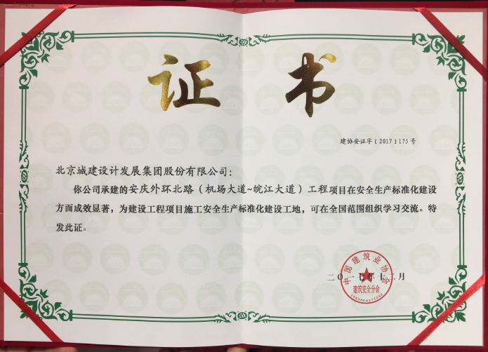 Recently, Construction Safety Branch of China Construction Industry Association successfully convened its 2017 annual meeting and council meeting in Wuhan. At the meeting, the north outer ring road of Anqing constructed by UCD has obtained the honorary title of“National Safety Production Standardization Construction Site”and won related award for the company’s outstanding achievements made in safety production standardization construction. At the same time, UCD has scored additional 4 marks of Beijing construction market credit rating.