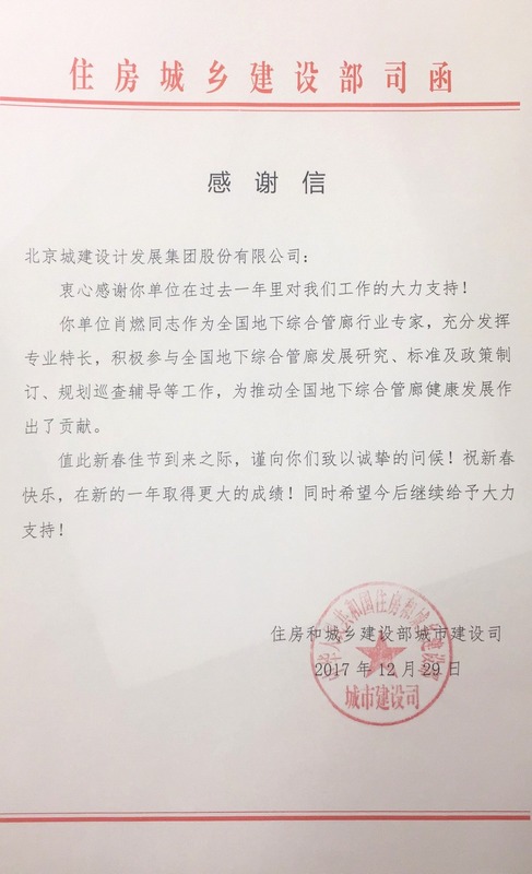 The pipe rack expert team led by Xiao Ran has actively participated in the national underground pipe rack development research, formation of standards and policies, and inspection and tutoring of plans. For this reason, MOHURD has sent a letter of thanks for the contributions made by the team to the development of the national pipe rack industry!