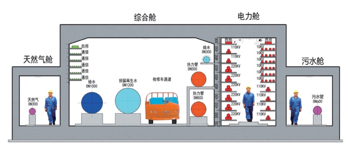 工程為多跨箱型框架結(jié)構(gòu),為三艙和四艙型式,分別為電力艙、綜合艙、天然氣艙及污水艙,艙室凈高為4.2米??茖W(xué)大道及錦繡路綜合艙室主通道可供檢修車通行,同時(shí)結(jié)合遠(yuǎn)期雁鳴路及中原大道設(shè)置環(huán)形檢修通道。