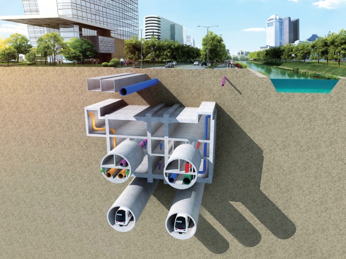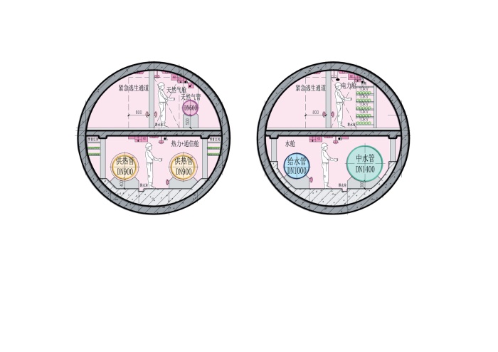 全線采用盾構(gòu)施工工法,結(jié)構(gòu)內(nèi)直徑D=5.4m的盾構(gòu)圓,形成兩個(gè)平行的綜合管廊。共設(shè)29座節(jié)點(diǎn)井,并將緊急逃生通道出入口(兼人員出入口)、進(jìn)風(fēng)風(fēng)亭、排風(fēng)風(fēng)亭、吊裝口、及管線分支口進(jìn)行有機(jī)整合,使附屬設(shè)施系統(tǒng)功能在節(jié)點(diǎn)井統(tǒng)一實(shí)現(xiàn)。入廊管線涵蓋:10kV電力電纜、通信管道、給水管線、中水管線、供熱管線、天然氣管線,同時(shí)預(yù)留電力電纜和通信管道托架。