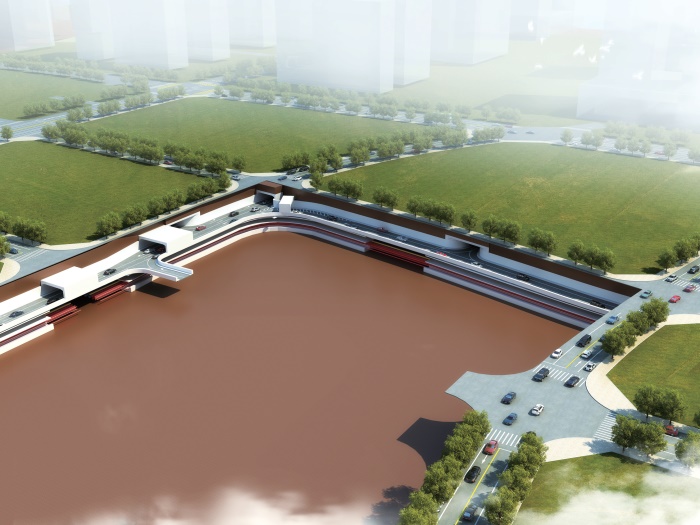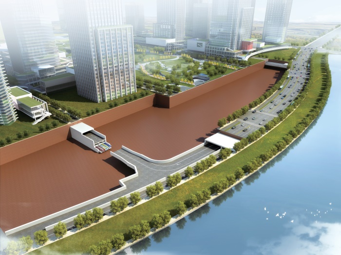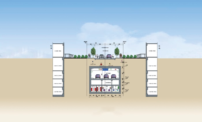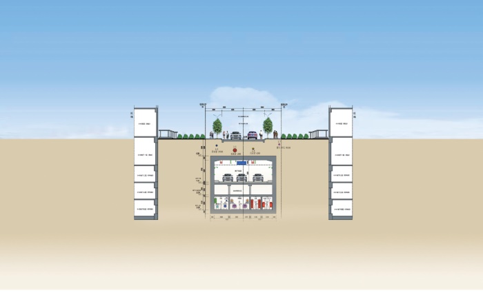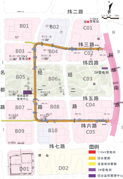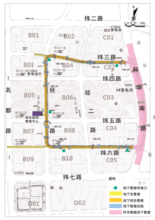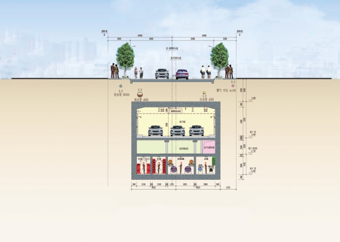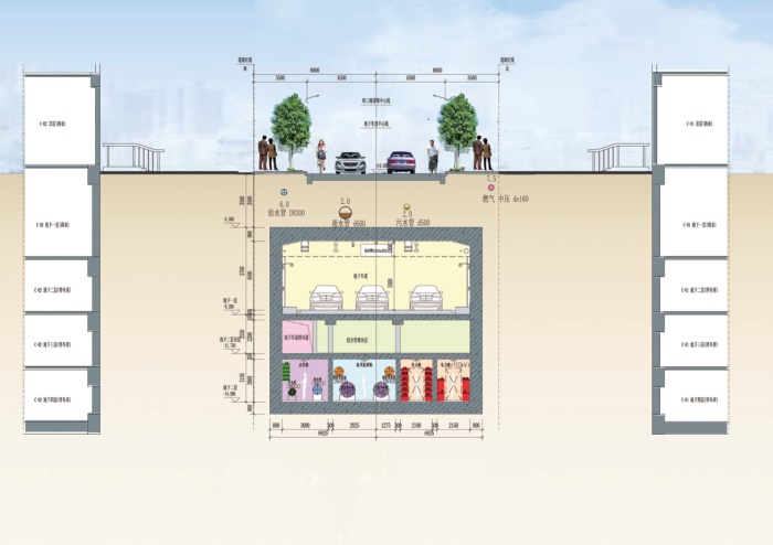 入廊管線含電力電纜、通信管道、給水管、供冷管、供熱管、中水管,燃氣管、排水管(雨水、污水管線)未入廊。地下車道和綜合管廊主線隧道疊合設置于錦云東一巷(緯三路)、錦泰路(經一路)、錦云東四巷(緯六路)道路下。地下結構分三層布置,地下一層為地下車道層,地下二層夾層為支管廊層,地下二層為地下綜合管廊層。