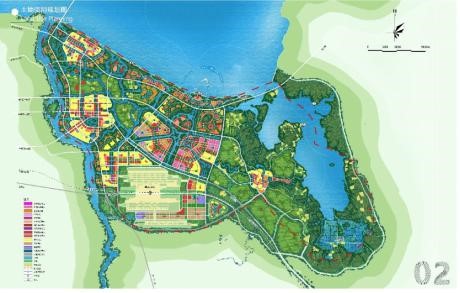 The scheme proposes the construction of a new spatial relationship structure comprising water resources, land, urban areas, rural areas and farmland to mark out grouped and island-shaped space areas to form an overall spatial layout of “one city with six islands and several groups” by means of “river harnessing, island construction, effective connection and city forming” and, the sheme holds that the technical measure of partially heightening the water surface ratio and the landscaping ratio should be used to improve the microclimate environment and to build a super cluster of islands where vegetation can grow freely, partial temperature control can be effectuated and phased group development can be conducted.