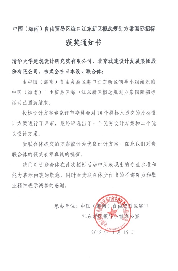 In June, 2018, the Urban-Rural Planning & Architectural Creative Center of Beijing Urban Construction Design & Development Group Co., Ltd. (hereinafter referred to as “UCD Creative Center”) joined hands with the Architectural Design and Research Institute of Tsinghua University and Nihon Sekkei to form a combo for the scheme competition. Through a series of selections, the combo stood out with its talent revealed from among more than 60 renowned Chinese and foreign institutions that signed up for the bidding. Through hard work for more than two months, the scheme devised with UCD Creative Center as the chief technology supervisor found favor with the experts and was rated as a good one at the accreditation meeting held on September 28, 2018! On November 15, the leading group office of Haikou Jiangdong New District of China (Hainan) Pilot Free Trade Zone issued an official award notice.