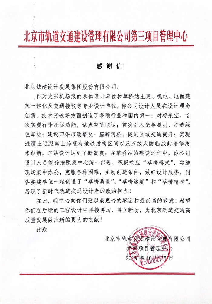 Recently, Beijing Rail Transit Construction Management Co., Ltd. sent a letter of thanks to Daxing Airport Line Design Team for their help and support given in the construction of the Daxing Airport Line.