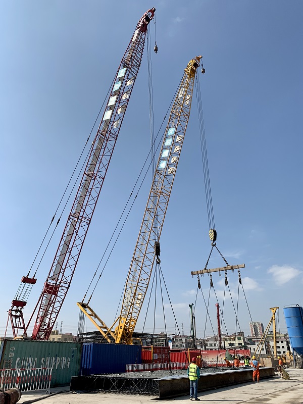 According to reports, the north side of Dongsha Station is close to the 220kv high-voltage line, which is parallel to the foundation pit in an east-west direction. The horizontal projection line is 0.05 to 3.95 meters away from the side of the envelope and the vertical direction is 16 to 21 meters away from the ground, posing great challenges to the on-the-spot reinforcement cage hoisting. According to the JGJ46-2005 “Technical Specifications for Safety of Temporary Electricity on Construction Sites”, the horizontal and vertical distance of 220kv high-voltage line is 6m as the safety distance. The length of the reinforcement cage of the diaphragm wall of building envelope on the north side ranges between 20.435 meters ~ 22.905 meters. In order to meet the safe construction distance under the high-voltage line, the constructor installed height-limiting facilities under the high-voltage line along the east-west direction of the station to ensure that the equipment is operated outside the safe distance of 6 meters on the high-voltage line. With the height limitation taken into consideration, the management team of the second work area of Guangzhou Line 10 decided to use the reinforcement cage of the continuous wall in the form of section hoisting for construction. In order to ensure that no errors would occur when the reinforcement cage was hoisted in sections, the technical department formulated a rigorous and thorough construction plan. During the manufacturing process, the construction quality of the reinforced joints was being brought under strict control. The hoisting process ensured the precise positioning of the steel cage, and the joint work was being well done to ensure the joint pass rate to reach 100%.