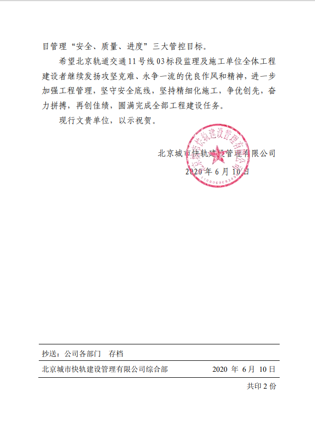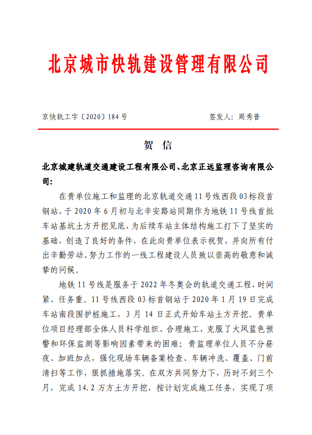 Congratulatory Letter for No.03 Section of the West Part of Beijing Subway Line 11 (Winter Olympics Sub-Line)