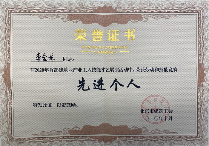 In order to further promote the building and reform of industrial workers in the new era, boost the skill upgrading and all-round development of construction workers, and show the style and skills of construction workers in the new era, Beijing Construction Trade Union organized the 2020 Skills and Talents Exhibitions of Beijing Construction Workers from May to October in 2020. The labor union of UCD selected and submitted four excellent works to the exhibition event upon internal selection and recommendation work. After evaluation, the “Jinlong Cloud System” skill exhibition video prepared by Li Jinlong Innovation Studio stood out, for which Mr. Li Jinlong won the “advanced individual” award in the labor and skill competition. Congratulations to Li Jinlong and his team!