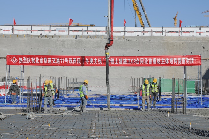 On the morning of November 27, at the construction site of Shougang Station next to the west extension line of Chang'an Avenue, concrete was continuously pressed by the pump trucks onto the last section of checked and accepted roof. It indicates that the main structure of Shougang Station was completed three days ahead of schedule, and it was the first station whose main structure was completed in the west section project of Line 11.