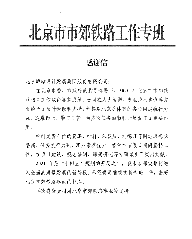 The year 2021 is the first year of the 14th Five-year Plan period, when suburban railway construction will enter into a new stage of high-quality development across the board.  With strenuous efforts, staff workers of the Beijing General Department have made outstanding contributions in terms of project construction, making of plans, subject study, etc., winning praise from the Beijing Municipal Commission of Development and Reform.