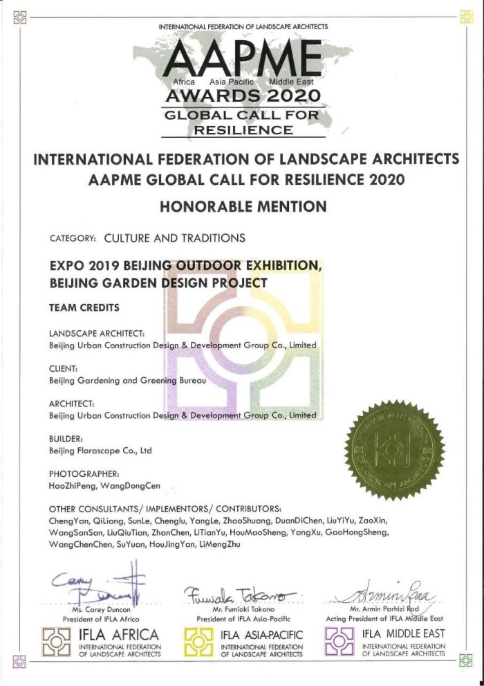 Beijing Garden Design Project of Expo 2019 Beijing Outdoor Exhibition, designed and operated by the creation center team of UCD, won the honorable mention of AAPME Culture and Tradition.