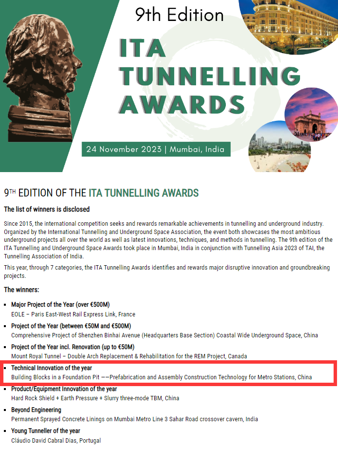 On Nov. 24, the 9th edition of ITA Tunnelling Awards(2023)was disclosed. The “prefabrication technology for underground metro station structure”, with its research and development headed by the National Engineering Research Center for Green and Safe Construction Technology in Urban Rail Transit honorably won the only award of Technical Innovation of the Year.