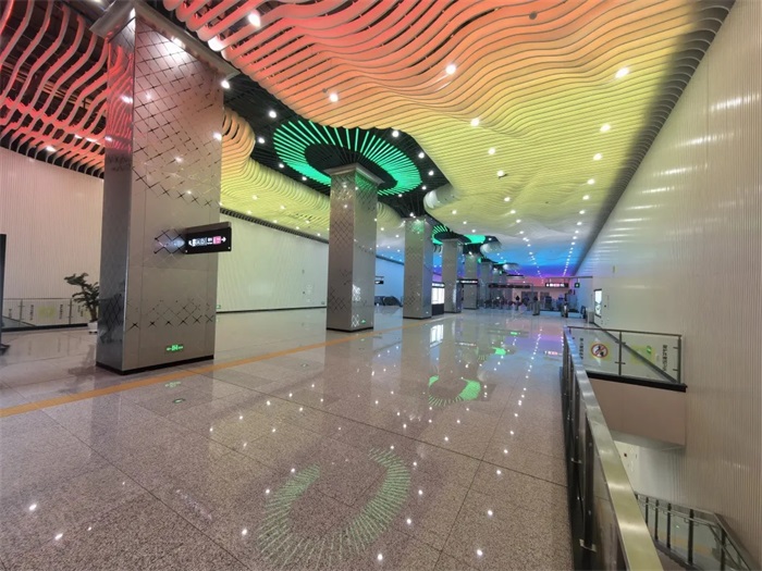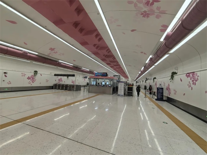With “Happy City of Changchun, Glamorous City of Charms” as its design theme of decoration, the line displays extremely vigorous modern city life featuring rich, beautiful and glittering colors. The postmodern design language is used to forge an easy and lively rail transit space to realize the integration of space and art. For instances, the Feiyue Guangchang station takes the Hongqi automobile culture as its theme to blend in the time tunnel concept, speed and motion and reflect the rapid development of Hongqi automobiles and Changchun to form one-of-a-kind design symbol of auto culture; the Yinghuajie station takes the Yinghua Street (cherry blossom street) as the inspiration of design and fully uses the prefabricated station space effect to depict the blossoms in doodle, manifesting the theme of cherry blossom, growing, goodness and hope.