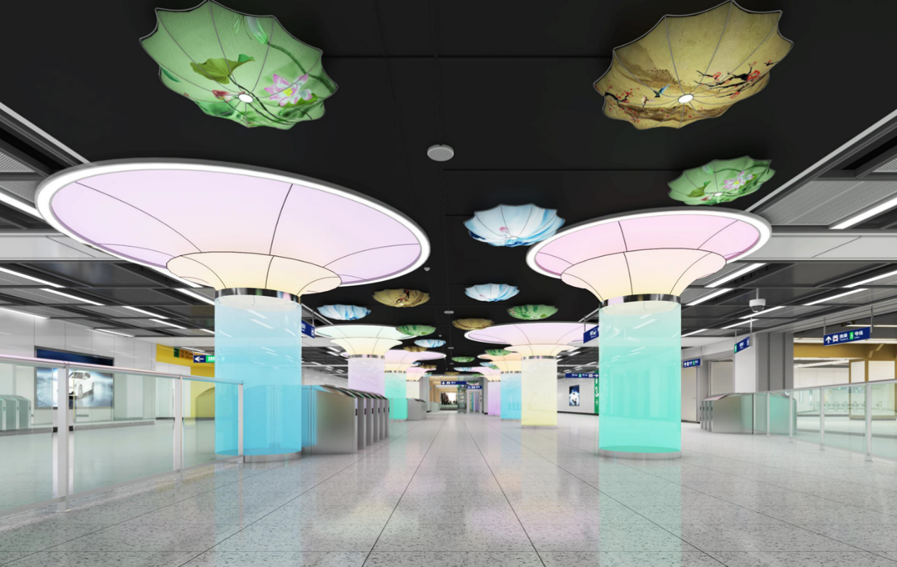 During the project design, UCD has followed the philosophy of station-city integration. Multiple stations, including Sanshanjie and Fujianlu, are co-built with adjacent buildings. By means of co-constructing and sharing metro stations with surrounding pedestrian systems, bus transfers, and the urban built environment, the design effectively integrates urban infrastructure resources around the stations, advancing a unified and mutually beneficial blending of subway stations with their surrounding space, functions, and environment. It also adds elements of "cultural heritage preservation and historical culture". For example, archaeological relics unearthed during metro construction are subtly combined by establishing a cultural relic display area in the station hall of Fuzimiao Station, which creates a micro-exhibition platform showcasing the historical context of Jinling, the ancient capital. The station design covers the Qinhuai Lantern, a kind of intangible cultural heritage. Fuzimiao Station is brimming with splendidly colored glazed glass columns and dynamic lantern-shaped decorations, making Nanjing Metro Line 5 resemble an underground cultural gallery traversing the city.